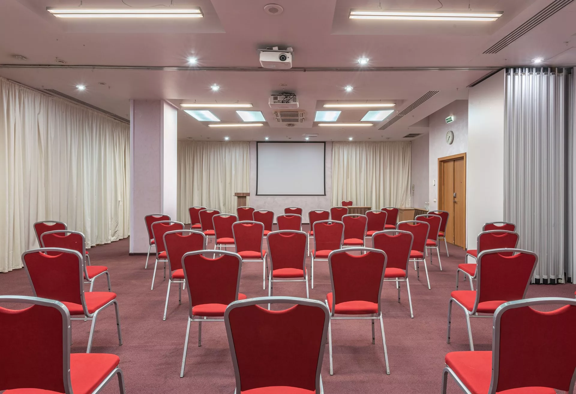 Зал оборудован проектором, микрофонами, флипчартами, стойкой для переговоров