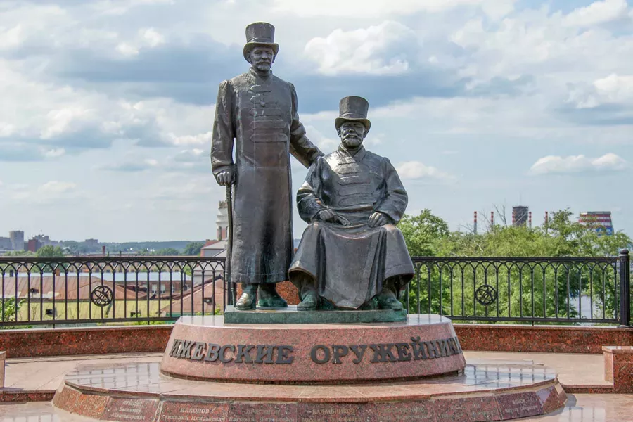 Памятник изображающий двух дореволюционный мастеров в парадном наградном одеянии. Постамент заслуживает отдельного внимания – на нём по кругу размещены имена выдающихся конструкторов, работавших в городе, а свободное место оставили для будущих трудовых подвигов молодого поколения.